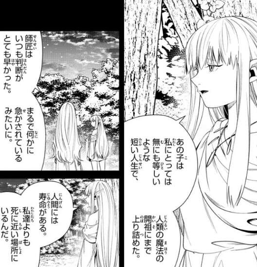 ゼーリエは、フランメは本当に魔法が好きだったんだ、世界中の人がそんな魔法を使えるようになって欲しいと本気で願っていた、と言います。ゼーリエはそんな時代はずっと先だと思っていて、フランメには実現不可能なことだとも思っていました。しかし、フランメはゼーリエにとって無にも等しいような短い人生で人類の魔法の開祖にまで上り詰めた、と語ります。人間には寿命がある、私達よりも死に近い場所にいるんだ、と言い、人間は重大な決断をしなければならない時がいくつもあるが、人間はそれを先送りできず、エルフは百年後、二百年後に先送りできる、千年ほったらかしにしたところで何の支障もない、とゼーリエはフリーレンに言います。