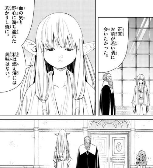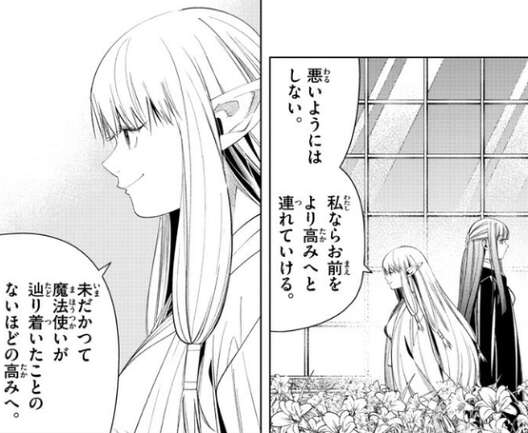 魔力が揺らいでいると指摘したフェルンに、ゼーリエは自分の弟子になるように言います。フェルンは、え、嫌です、と即答しますが、ゼーリエは、悪いようにはしない、と言い、私ならより高みへと連れていける、とフェルンにさらに問いかけます。フェルンは、合否と関係があるのか聞きますが、あるかもしれない、とゼーリエはあいまいに答えます。