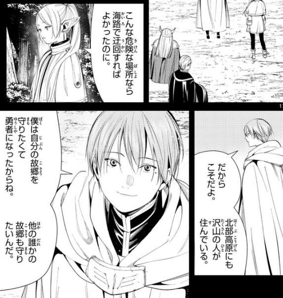 シュタルクに海路が良かったのでは?と言われ、フリーレンはヒンメル達と旅をしていた時の事を思い出します。その時も危険な場所で強力な魔物と戦っていて、こんな危険な場所なら海路で迂回すればよかったのに、とフリーレンはシュタルクと同じようなことをヒンメルに言いました。するとヒンメルは、だからこそだよ、北部高原にも沢山の人が住んでいる、僕は自分の故郷を守りたくて勇者になったからね、他の誰かの故郷も守りたいんだ、とフリーレンに答えます。