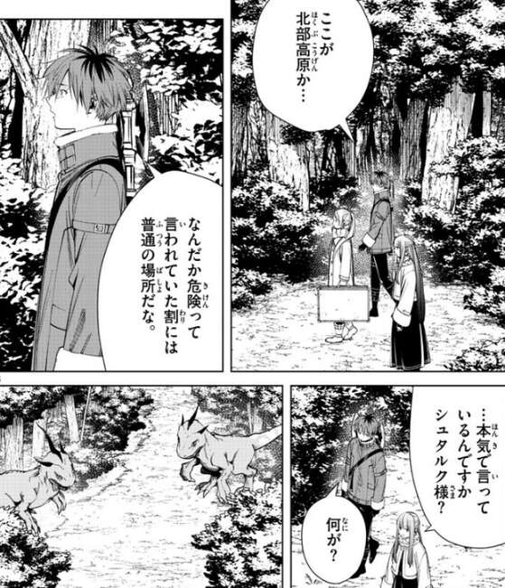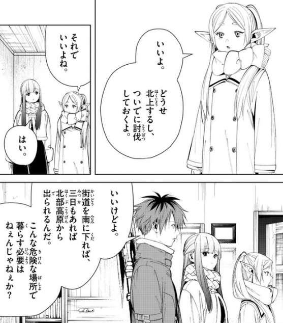 フリーレンは、いいよ、どうせ北上するし、ついでに討伐しておくよ、と気軽に頼みを引き受けますが、シュタルクは街道を南に下れば三日もあれば北部高原に出れる、こんな危険な場所に暮らす必要はないんじゃないか?と、村人やフリーレン達に疑問を口にします。