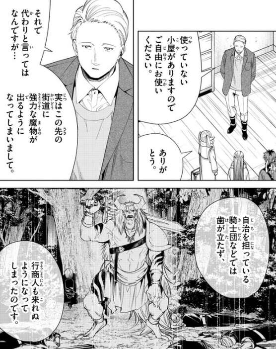 何とか魔物の群れを退けますが、三日三晩気が抜けず、フリーレン達は死ぬ思いをしてやっと集落にたどり着きます。集落では村人から、使っていない小屋を自由に使っていいと許可を貰えますが、その代わりとしてこの先の街道に出る強力な魔物を討伐して欲しいと頼まれます。その強力な魔物は自治を担っている騎士団などでは歯が立たず、行商人も来れぬようになってしまったようです。