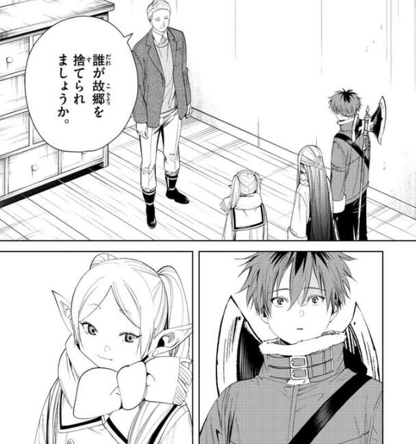 誰が故郷を捨てられましょうか、と村人はシュタルク達に語りかけると、シュタルクは少し驚いたような表情をします。翌朝、フリーレン達は集落を旅立ち、街道を進んでいきます。旅立つフリーレン達を村人は見送りながら、頼みましたよ、と声を掛けます。