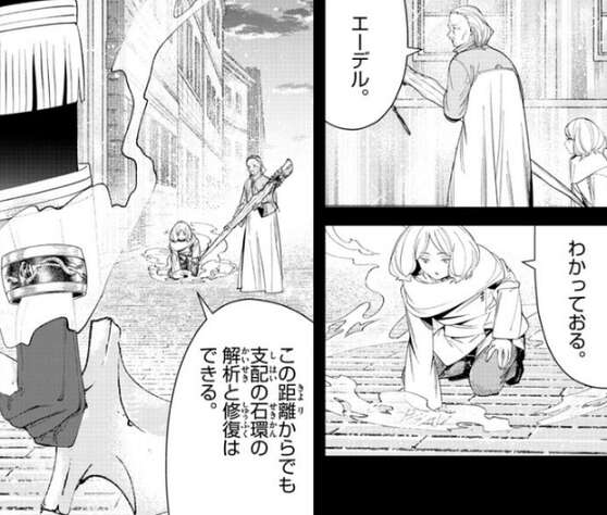 レルネンはエーデルに支配の石環の解析と修復を指示すると、自分はマハトと戦って時間を稼ごうとします。マハトはレルネンを黄金に変えようとはせず、殺して見せしめにすることを優先します。