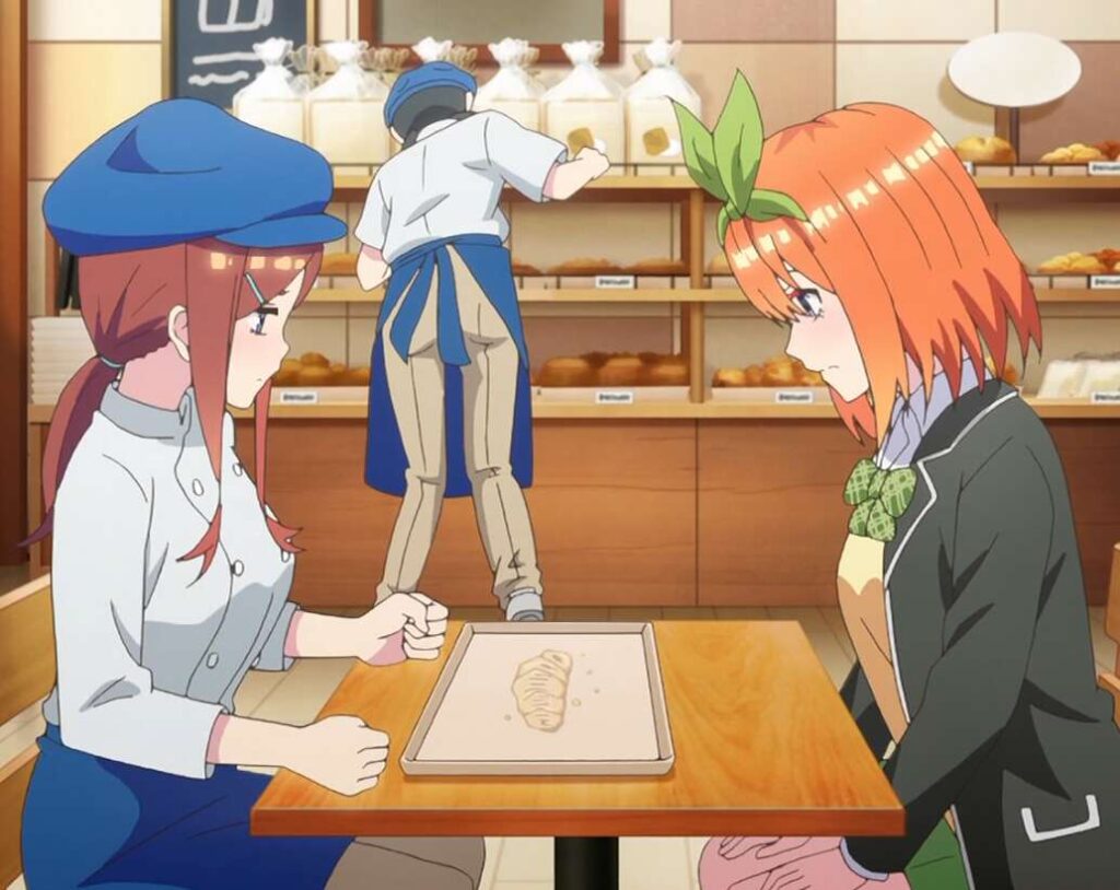 三玖がバイトでパン作りをしていますが、店長の助けを借りてもなかなか上手くいきません。何度か四葉に見てもらい、やっとパンと言えるレベルのものを作ることに成功します。