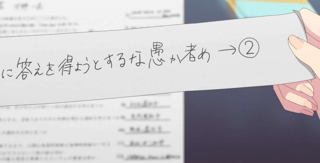 はやく勉強を終わらせて風太郎の元に向かおうとする五つ子たちですが、なかなか問題を終わらせることが出来ません。その時五月はカンニングペーパーを見ませんか?と、皆に言い出します。なりふり構ってられません、と五月が言うと、五つ子たちは仕方がなくカンニングペーパーを取り出します。