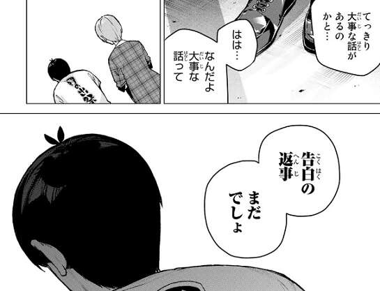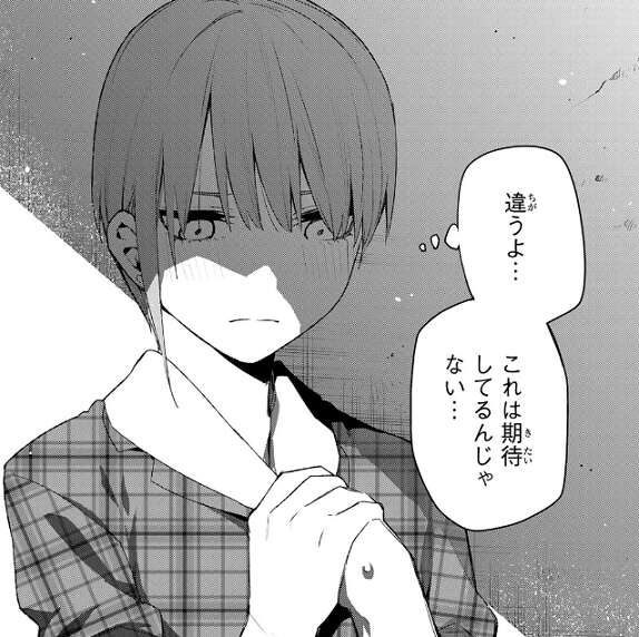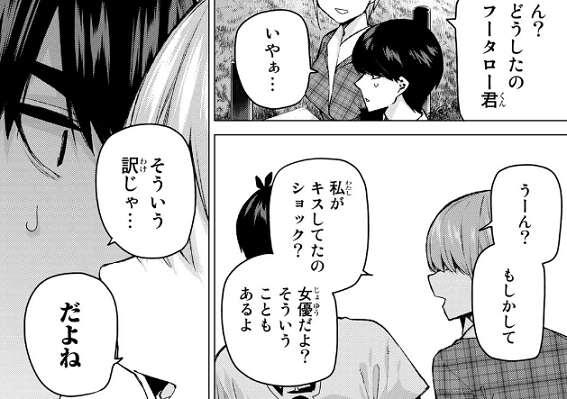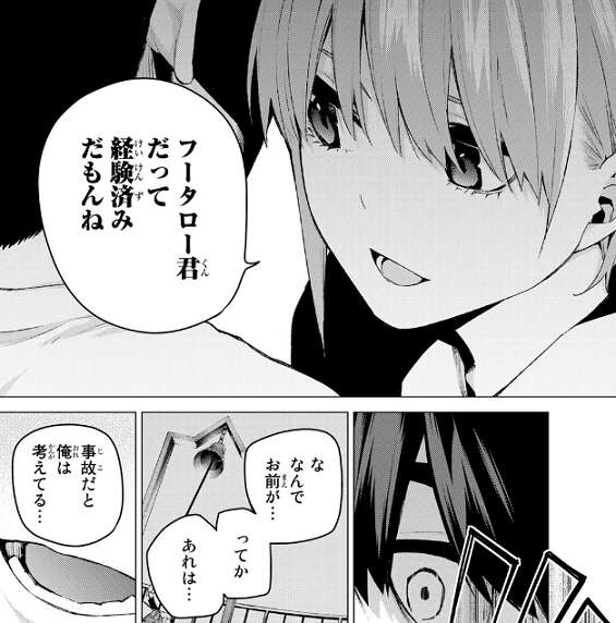 さらに一花から風太郎も経験済みだと言われて、「誓いの鐘」でのキスを思い出してしまい、とっさに事故だと俺は考えてる…、と答えます。一花は風太郎が本当にキスをしてたことに驚き、相手は誰か聞いてきます。