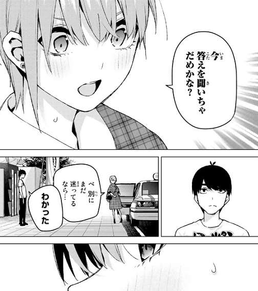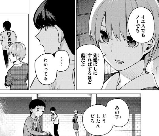 一花はそれだけ?と思わず言ってしまいます。そして告白の返事まだでしょと言い、風太郎にイエスでもノーでも先延ばしすればするほど酷だよ、と一花は忠告します。その時、迷子になっている男の子を見つけ、一花と風太郎は男の子の母親を一緒に探します。
