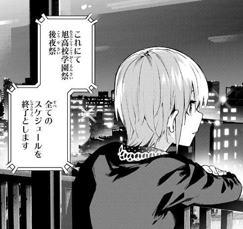 一花は学園祭 後夜祭が終わり、全てのスケジュールが終了したアナウンスを、ベランダから夜景を眺めながら聞いています。