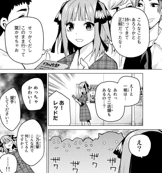 そして一花は学園祭を訪れますが、一花は急に仕事が無くなったから来ただけ…、別に何の期待もしてないし…、と自分自身に言いきかせます。学園祭を歩いていると女優の自分がこの学校に通っているという噂が流れていて、一花はバレたら大変と二乃に変装して学園祭をまわろうとします。しかし、二乃はオープニングダンスで目立っており変装しても追いかけられてしまいます。