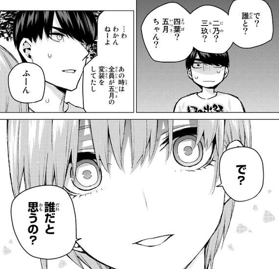 二乃か、三玖か、四葉か、五月ちゃんか?と一花に詰め寄られ、風太郎は全員が五月に変装していた事を正直に言うと、さらに風太郎は誰だと思っているのか一花に真顔で聞かれます。