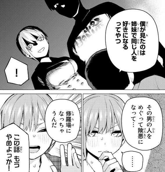 迷子の男の子からもしかしてモテモテ?とツッコまれ、そういうのは良くないって前にドラマでやってたと男の子に言われてしまいます。そのドラマでは姉妹が同じ人を好きになって、男の人をめぐって険悪になり修羅場に発展する内容だったようです。一花はドラマの内容を聞き、複雑な心境になり話を途中でやめさせようとします。しかしそのドラマの最後に興味を持った風太郎が男の子に最後どうなるか聞いてしまい、最後は片方と結ばれ片方とはそれっきりと聞かされ、一花は後味悪いねと感想を言います。