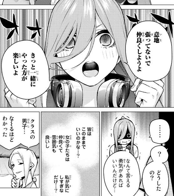 たこ焼きをクラスの女の子たちにも食べさせてあげたいな、と三玖は言い一日目が終わったら皆を連れてくると言います。男子からはそんなこと急に言われてもなぁ…、と渋られますが、三玖から全部終わって卒業したあとも言い学園祭だったねってみんなに喜べるものにしようと後押しされます。