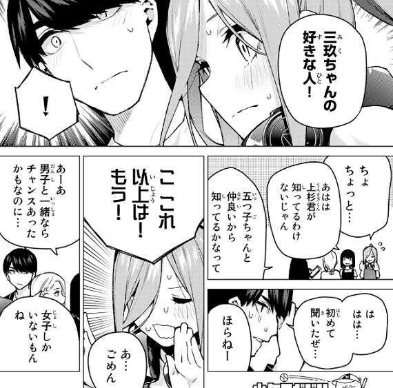 風太郎がパンケーキ屋 屋台の安全チェックに訪れた時、クラスの女子から風太郎に三玖の好きな人を質問されますが、さすがにこれ以上は無理と質問を強引に終わられます。風太郎から男子とさっさと和解するように言われ、今度は私が男子の敵情視察に行って、仲よくする機会を探ろうと三玖は考えます。