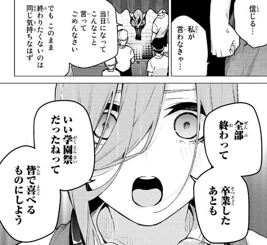 この後風太郎とは一旦分かれて、15時に教室で風太郎と五つ子たちが集まって、風太郎の突然の告白となるようです。風太郎から強くなったと言われ、勇気を出せばどんな不可能も変えられるんだ、と三玖は自分が頑張れたことを素直に喜びます。