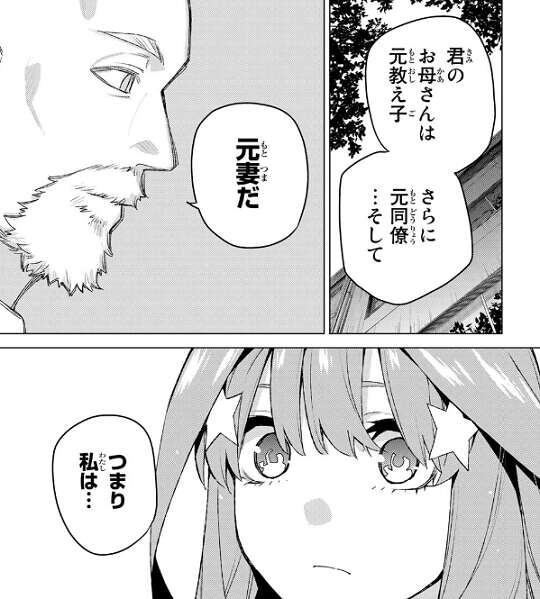 母親も学校の先生だったと付け加えると、自分は五つ子たちの母親の担任教師だったと無堂は打ち明けます。そして五月が若い頃の母親に歪なほどそっくりだ、五月がお母さんの後を追っているだけならお薦めしないと無堂は忠告します。