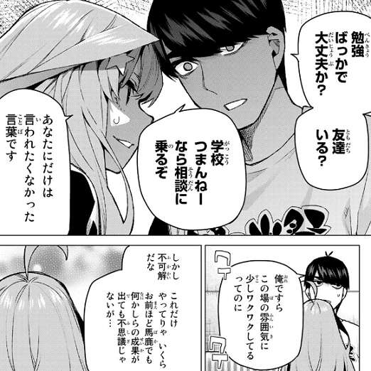場面変わって学園祭初日、風太郎は五月が学祭中でも一人で自習をしていると聞いて、勉強ばっかで大丈夫か、学校つまんねーなら相談に乗るぞと、五月を心配します。いつも一人で勉強ばかりしていた風太郎に言われたくないと、五月は言い返します。風太郎は五月が勉強を頑張っているのに、成果が出ない事を不思議がっていると、負けず嫌いの五月はかなりの量の問題集をさらにこなそうとします。