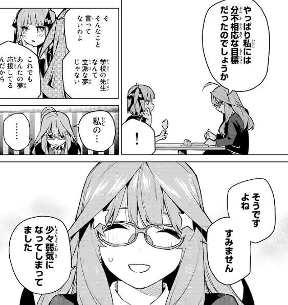 二乃にも心配され二乃は五月に食べ物を奢ろうとしますが、五月は全てを終わらせるまで邪念は断つと食べ物を断ります。五月は教師という夢は分不相応な目標だったのでしょうか、とつい弱気になってしまいますが、二乃からは学校の先生なんて立派な夢だと、五月の夢を応援していると励まされます。二乃は父親に招待状を送った話をし、こういう時に道標になってくれるのが親の役目だと言います。