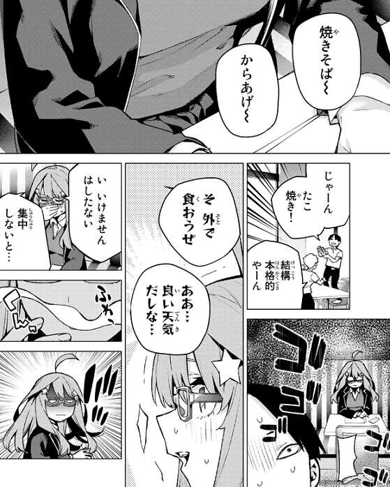 その後、五つ子全員と風太郎が集まり風太郎の告白を聞いた後の場面、五月は今まで我慢していた反動で置いてあったからあげを全部食べてしまい、四人を驚かせます。