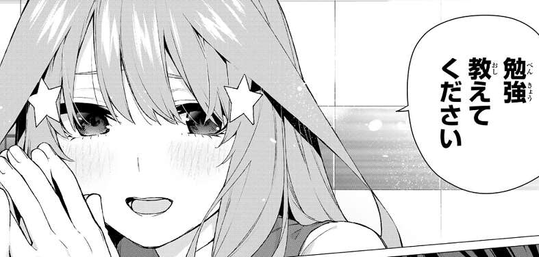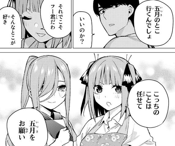 五月が先生になりたいと願うなら、家庭教師として全力でサポートすると風太郎は五月に言います。すると五月は風太郎に勉強を教わることを嫌がっていた以前までとは違い、素直に勉強を教えて欲しいと風太郎にお願いします。勿論だと快諾する風太郎です。