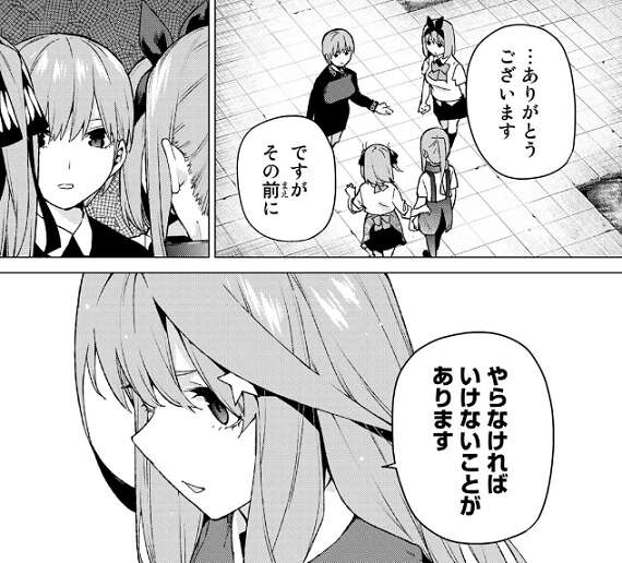 無堂から自分の夢を否定されて激しく動揺し部屋に籠ってしまった五月ですが、風太郎に間違っていないと励まされ、学校の先生になるという夢を再び五月は目指します。そして五月は無堂に再び会いに行こうとしますが、学園祭には一花たち四人も集まっています。五月編は2話で終わらずまだ続くようですが、来週は五つ子全員が集まって無堂と向き合う流れでしょうか。