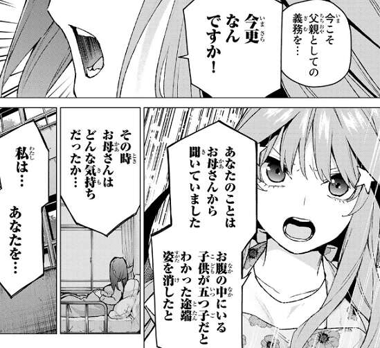 今からでも罪滅ぼしをさせてほしい、父親として娘に出来ることをしたいと言う無堂に対し、既にお父さんならいると私たちに関わらないように五月は言います。しかし、中野は父親としては不合格だと無堂は言い、血の繋がりが親子には必要不可欠だと五月に言います。さらに母親が死んだ時、中野が五つ子たちに、五月に何をしてくれた?質問します。