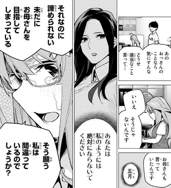母を目指して夢を追うのと、夢を目指して母を追うのとでは大きく違うが、五月がそれを理解出来ていて、その上で親に憧れて志すことは絶対に間違いじゃないと風太郎は五月に言います。風太郎から間違っていないと励まされ、母親のような先生になりたいと、自分の意思で母親を目指すと、五月は改めて宣言します。