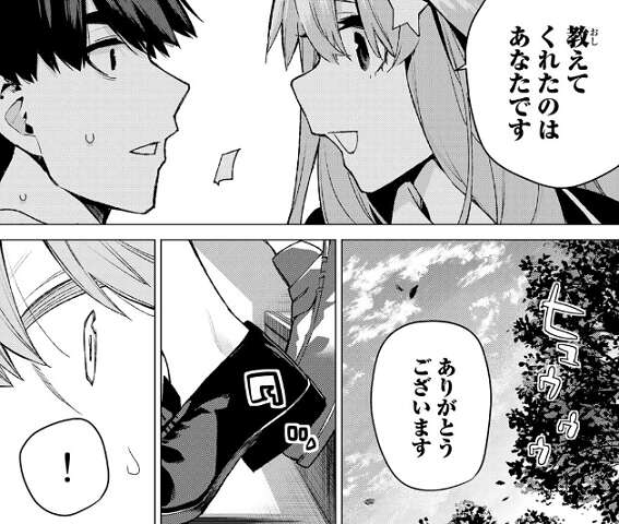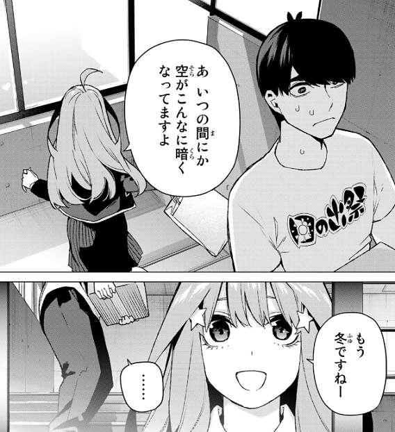 敬語なしの喋り方を風太郎に指摘され照れてしまう五月ですが、母脱却ということだと理由を話します。居心地悪いから普段通りにしてくれと風太郎には言われますが、五月はあくまで敬語なしの喋り方を続けるようです。