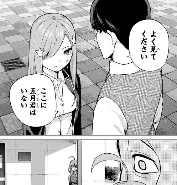 しかし中野父はここには五月はいないと言うと、柱の陰から五月が現れます。無堂が五月だと思っていたのは五月に変装した三玖でしたが、無堂はただ間違えただけだと言います。しかし、五月は愛があれば私たちを見分けられるという母親の言葉を持ち出しますが、無堂はいい加減にしろと怒り、母親の事はすぐに忘れるように言います。