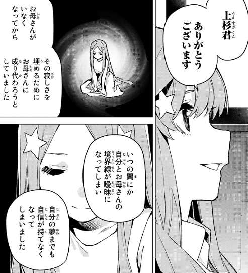 その後、五月は風太郎の仕事を手伝いながら二人で階段を昇っています。五月は風太郎に、お母さんがいなくなってからお母さんがいない寂しさを埋めるために、お母さんに成り代ろうとしていたと言います。しかしその結果自分とお母さんの境界線が曖昧になってしまい、自分の夢までも自信が持てなくなってしまったと五月は振り返ります。