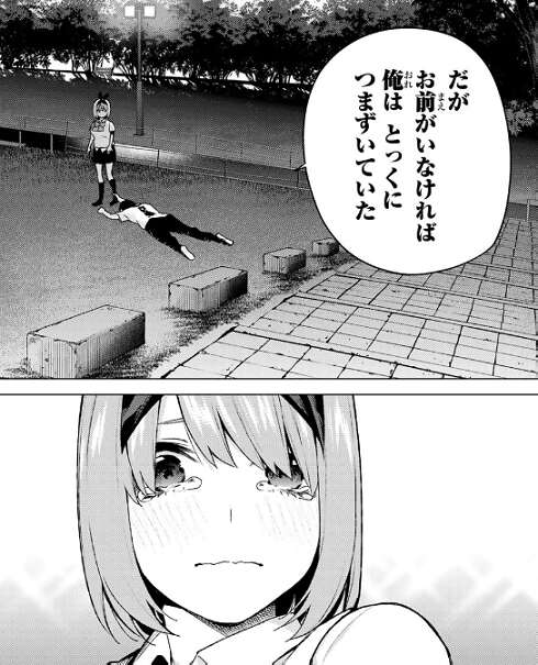 しかし風太郎は四葉がいなければ俺は とっくにつまずいていた告白します。そして風太郎は、自分は弱い人間だからこの先 何度もつまずき続けるだろうと言います。