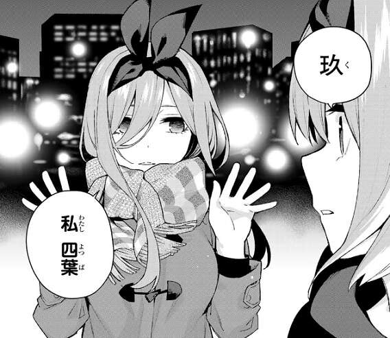 絶句している四葉ですが、三玖からどうかな?と質問され、駄目じゃないかな…、論理的に、と正論で返事をします。