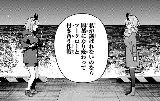 それに対して三玖は、私が選ばれないのなら四葉になり変わって、自分がフータローと付き合う作戦だと四葉に答えます。あまりの三玖のぶっ飛んだ作戦に絶句する四葉です。