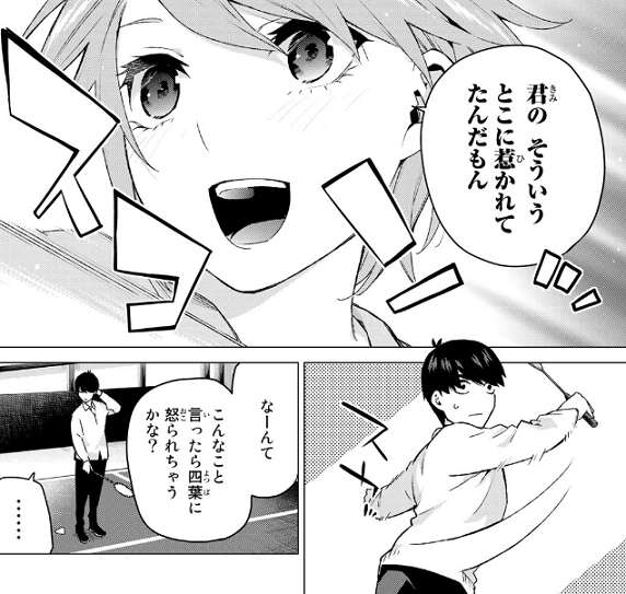 その後、バトミントンをした帰り道、風太郎から四葉に好きとちゃんと言っていないという話題から、一花は風太郎に恥ずかしいならまた私で練習してもいいんだぞ、と自分で好きと言う練習をしてもいいと風太郎をからかいます。自分は本気で悩んでいるんだぞ!と風太郎はからかってくる一花に抗議します。