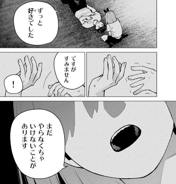 一花が四葉から何も聞いていないようだったので、風太郎は念のため一花に聞いていないか確認します。すると、昨日は久々に父親と一緒に食事だったから風太郎のことはあんま話題に上らなかったと聞かされます。話の流れ上、一花から何があったか質問され仕方なく、風太郎は四葉が俺のことを好きだと言ってくれた事を話します。興味津々で食いついてくる一花は、その後どうなったかさらに質問してきます。すると風太郎は、その後四葉からまだやらなくちゃいけないことがあります、と言われて実は風太郎と四葉はまだ付き合っていないこと、やべー地雷を踏んだかもしれないと不安になっている事を一花に告白します。