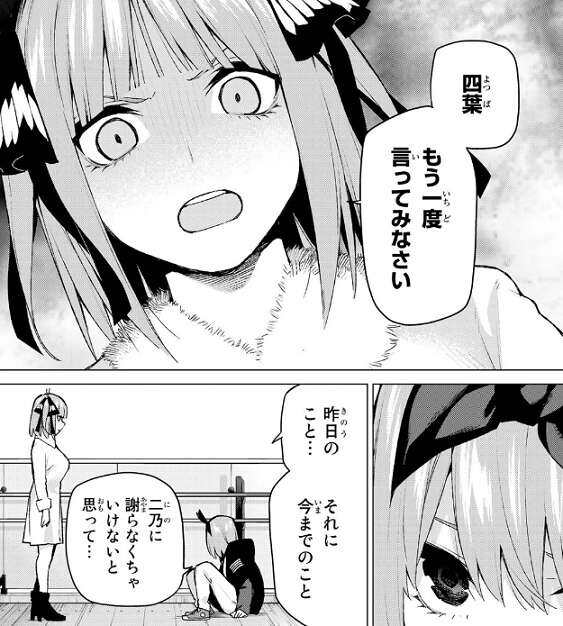 今 あんたに心配なんかされたくないわ!と怒る二乃に、二乃は大切な家族だから心配だよと四葉は言います。そんな四葉に怒った二乃は、もしこのままの関係が続くようなら姉妹の縁を切ると言い放ち、四葉の顔は青ざめます。