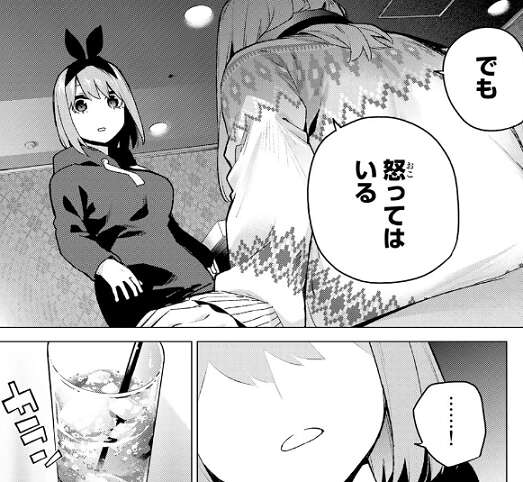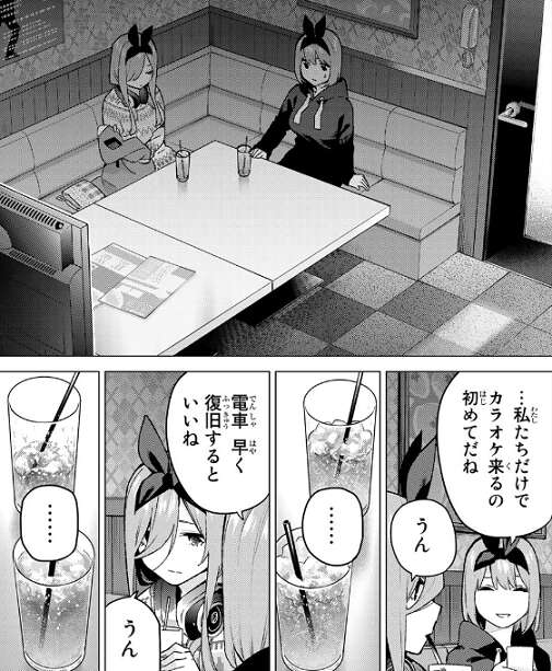 一花との電話が終わり四葉の所に戻ってくると、四葉がドリンクバーの前で飲み物を選んでいます。四葉が三玖に飲み物どうする?と質問すると、四葉と同じのと三玖は返事をしてきてます。その返事を聞いて四葉は少し困った表情をしつつもオッケーと返しますが、個室でも四葉と三玖は気まずい雰囲気のままで会話も弾みません。
