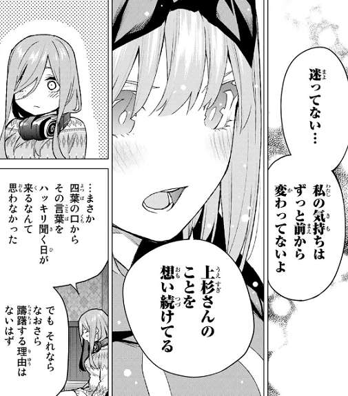 しかし、三玖から問い詰められた四葉は、自分の気持ちはずっと前から変わらず風太郎のことを思い続けているとはっきりと答えます。三玖は四葉の口からハッキリときく日が来るとは思わなかったと驚きますが、なおさら躊躇する理由はないはずと言い、四葉が前の学校でのことを気にしている事を指摘します。