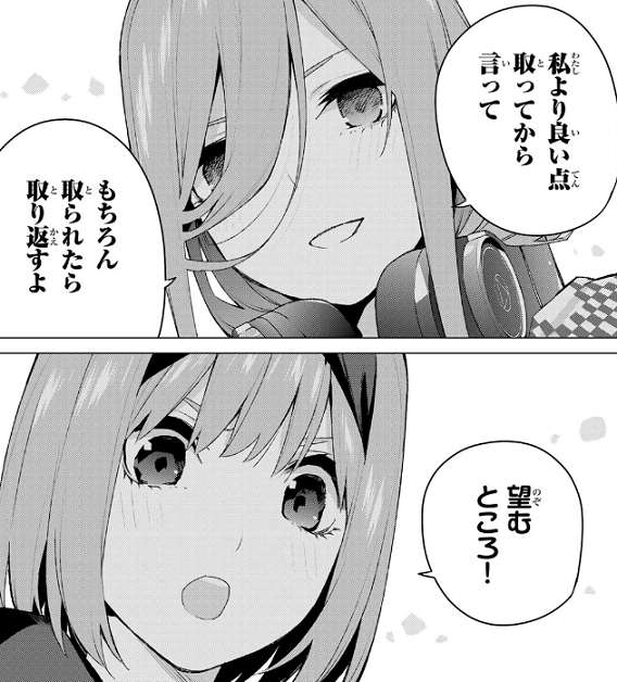 それを聞いた四葉はもう一度、ラブ☆バケーションをタブレットから選曲して、三玖に聞いてて、三玖より絶対上手く歌うからと言います。三玖は私より良い点とってから言って、もちろん取られたら取り返すよ、と言い、四葉も望むところ!と返します。