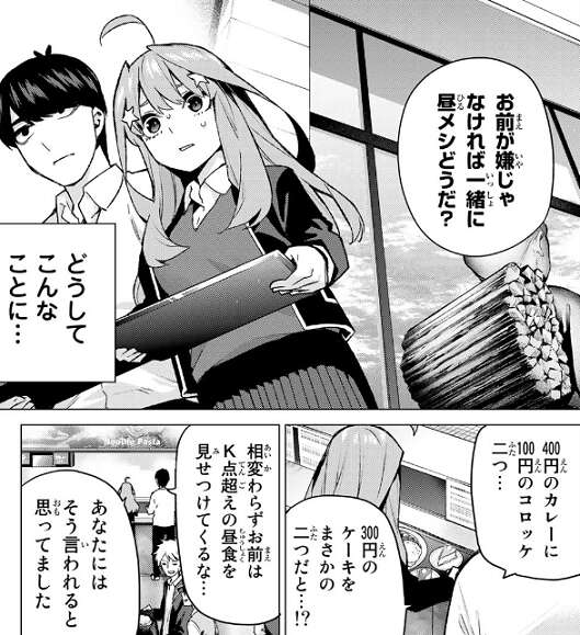 さらに二乃も現れて、二乃、四葉、五月、風太郎と四人が一緒になってしまいます。どうやら四葉が二乃を話があると誘って、お昼を一緒に食べようとしていたようです。