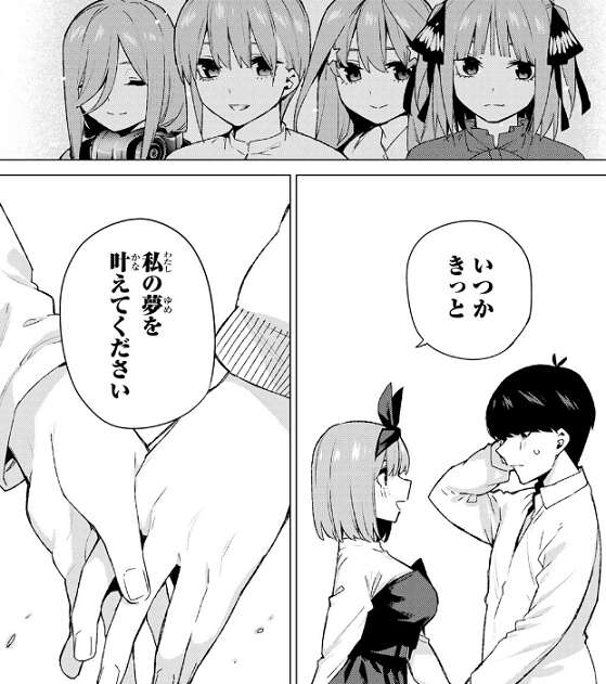 そして風太郎に、いつかきっと、私の夢を叶えてください、と四葉と風太郎は約束します。