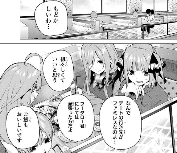 まず、風太郎が向かったのがファミレスです。四葉に好きなものを好きなだけ頼んでいいぞ!俺のおごりだ!と言っていますが、同じファミレスには他の姉妹、一花、二乃、三玖、五月が二人の様子をうかがっています。二乃は風太郎のプランに文句を言い、一花と三玖は風太郎をフォローし、五月はご飯もおいしいですといつも通り食べています。