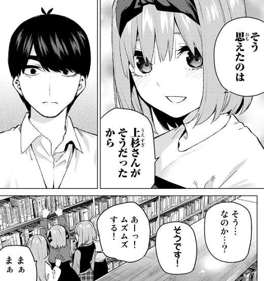 続いて風太郎と四葉は図書館に移動しますが、スマホに書いてある「困った時の話題」メモを見ながら、風太郎はこれからの目標や、夢について四葉に質問します。やっぱり誰かのサポートをして、支えることが自分に合っている、そう思えたのは、風太郎がいたからだと四葉は風太郎に言います。ここでも他の姉妹たちは二人の様子をうかがっていて、二乃がじれったくてムズムズしています。