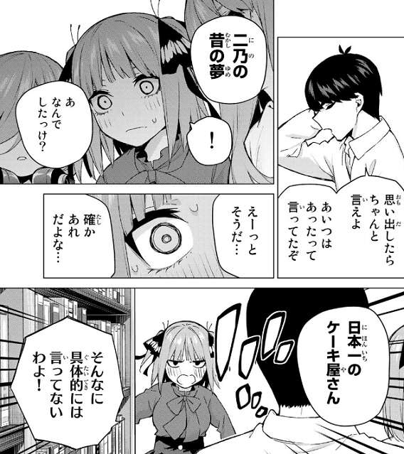 それでも具体的な目標を風太郎は聞きますが、四葉はもう忘れちゃいました!と笑ってごまかします。夢の話題から二乃の昔の夢の話になり、風太郎は日本一のケーキ屋さんと二乃が言っていたと明かしますが、たまらず二乃が二人の前に飛び出してそんなに具体的には言っていないと否定します。