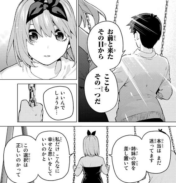 図書館を出た後、風太郎は最後に一箇所だけいいか?と、四葉と来た例のボロブランコがある公園へ向かいます。今日は風太郎の思い入れのある所に連れてってくれるはずじゃ、と言う四葉に、家族でたまに行くファミレス、よく勉強に使う図書館、そして四葉と来たその日からこの公園もその一つだと、ここも自分にとって思い入れのある場所だと風太郎は明かします。四葉は姉妹の皆を差し置いて、自分がこんなに幸せな思いをしていいのか、この選択は正しいのか、迷っている事を風太郎に明かします。
