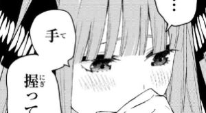 男子生徒から本当に付き合っているのか疑われてしまい、「恋人同士なら手を繋いで帰れるだろ」と煽られた際には、風太郎はとまどいますが三玖は「ギュッ」と手を繋ぎます。