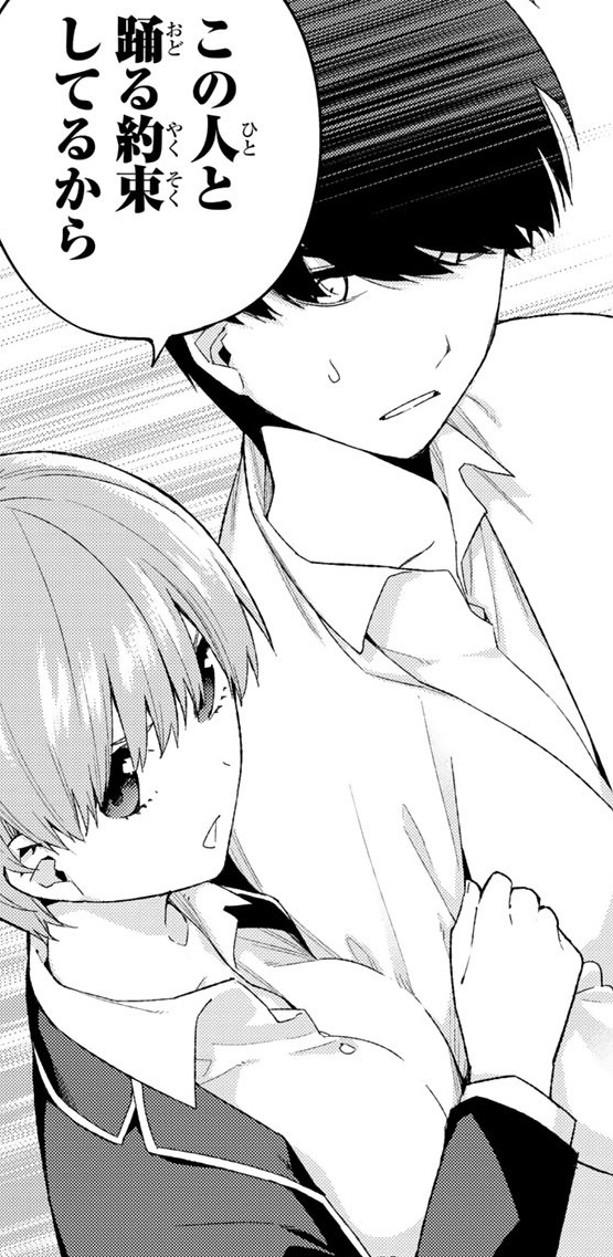 返事くらい待ってやれよ!と男子生徒を説得しますが、三玖からは「フータローが言うと説得力がない…」と逆に呆れられます。言い合いが続くなか三玖は「この人と踊る約束してるから」ととんでもない提案をします。