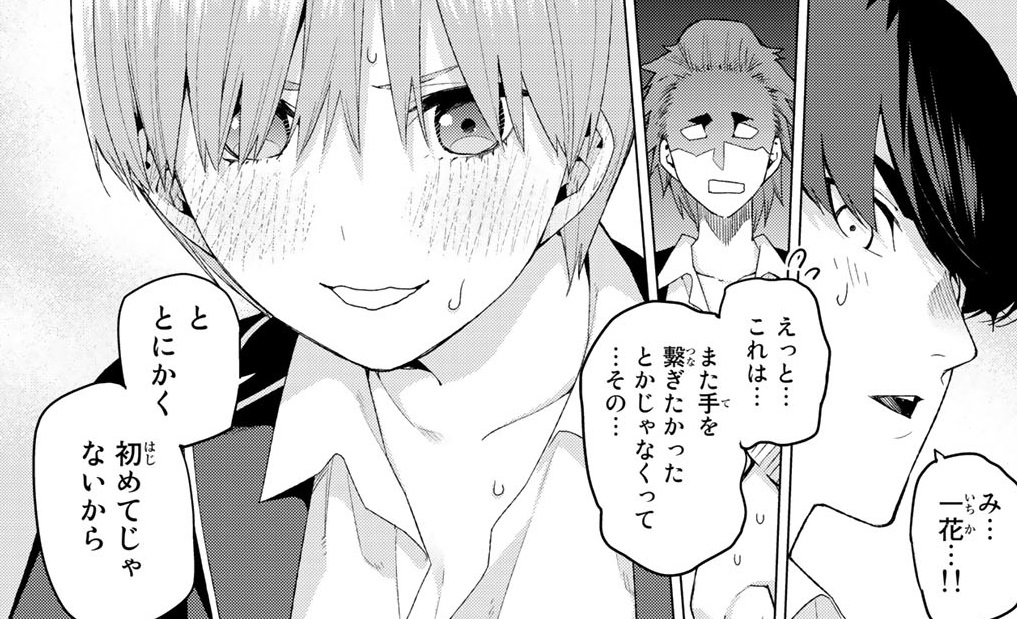 言い訳する三玖です。「とにかく初めてじゃないから」