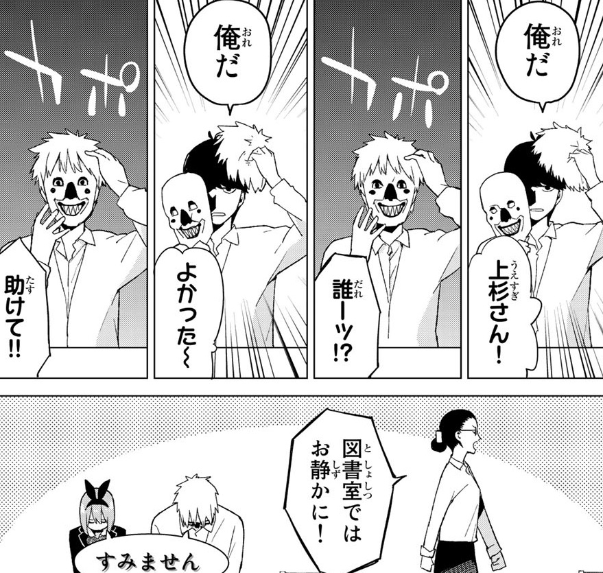 林間学校の準備を進めている風太郎ですが、何故かカツラにお面をつけています。これは林間学校での肝試しの役を担当しているからです。