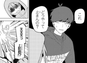二乃に追いかけられ、四葉にまで見つかりかけます。ちょうどそこにかまくらの中で隠れている三玖助けられます。四葉の無尽蔵のスタミナの話から、三玖が四葉にはハンデをもらおうと言います。足の速さを平等にしてもらった方が盛り上がるとの事ですが、風太郎はそういうのはあまり好きじゃないと言います。四葉の運動能力は後天的なもので、本人の努力によるものだからその努力は否定したくないと言います。
