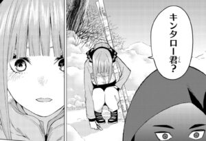と、ここで二乃もらった絆創膏を二乃本人に見つかってしまいます。金太郎と勘違いされていますが、金髪のかつらをつけていないので、すぐばれてしまいます。